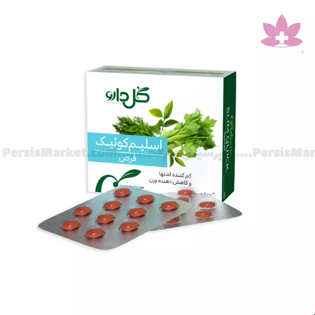 قرص اسلیم کوئیک گل دارو فرآورده ای طبیعی است که متشکل از گیاهانی همچون کرفس ، شوید و چای سبز می باشد . قرص اسلیم کوئیک به طور همزمان با مکانیسم های افزایش سوخت و ساز چربی ، کاهش جذب چربی ها در روده و کاهش اشتها موجب کاهش وزن می گردد