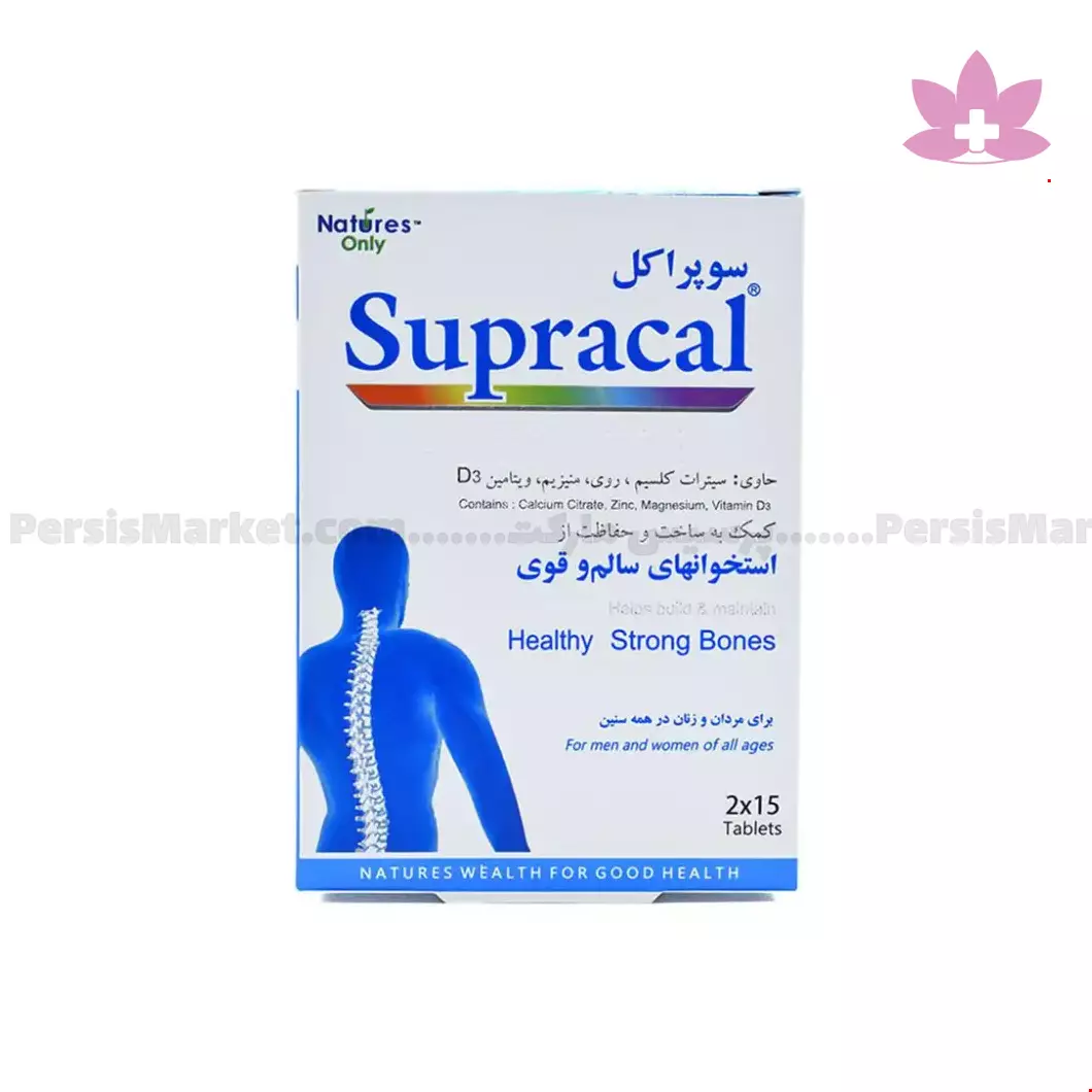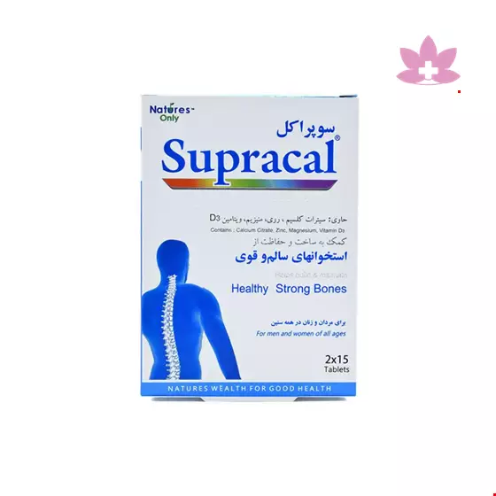 قرص سوپراکل نیچرز اونلی حاوی کلسیم، روی، منیزیم و 200 واحد ویتامین D3 بوده و مصرف آن جهت افزایش تراکم و پیشگیری از پوکی استخوان، پیشگیری از گرفتگی های عضلانی، تامین کلسیم و ویتامین D لازم در دوران بارداری و شیردهی توصیه می گردد. استفاده از ملح کلسیم سیترات در فرمولاسیون قرص سوپراکل نیچرز اونلی موجب افزایش جذب کلسیم و کاهش احتمال بروز سنگ کلیه می گردد.