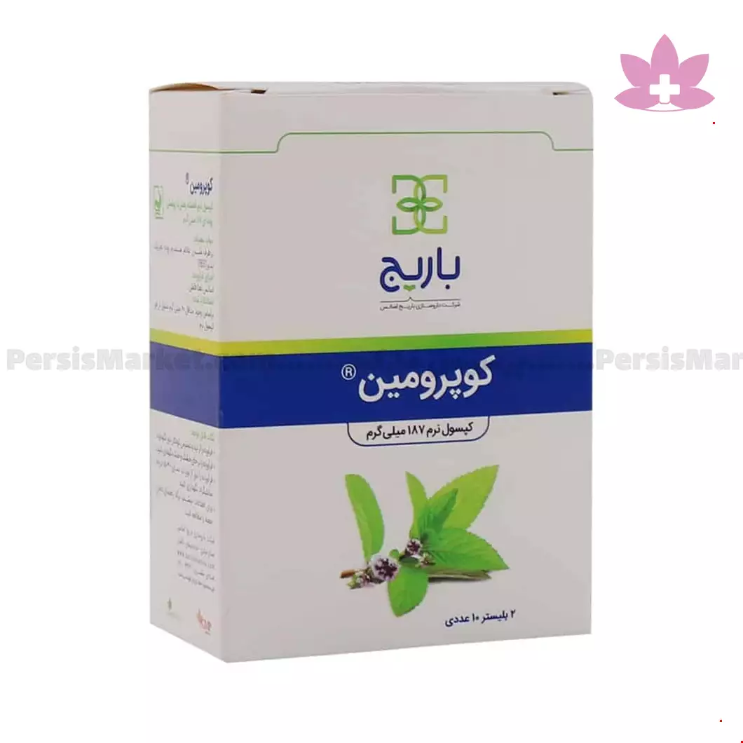 کپسول کوپرومین باریج اسانس حاوی نعنا فلفلی می باشد که جهت درمان و کاهش علائم سندروم روده تحریک پذیر (IBS) و برخی دیگر از بیماری‌های گوارشی مثل نفخ و حالت تهوع استفاده می‌شود. پوشش روده‌ای ویژه کپسول کوپرومین باریج اسانس باعث می‌شود که ترکیبات فعال مستقیماً در روده آزاد شوند و اثربخشی بیشتری در تنظیم حرکات گوارشی و جلوگیری از یبوست یا اسهال متناوب داشته باشد و تأثیر بیشتری در درمان علائم IBS دارد.